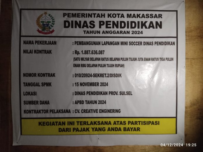 Panrita News, Makassar | Proyek pembangunan lapangan mini soccer Dinas Pendidikan (Disdik) Provinsi Sulawesi Selatan dengan nomor kontrak : 010/20924-SEKRET.2/DISDIK resmi dilaporkan Lembaga Komunitas Peduli Lingkungan Ekonomi Sosial (L-Kompleks) ke Kepolisian Resor Kota Besar Makassar, Rabu (12/03/2025).