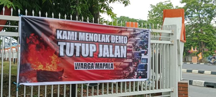 Pantauan Panritanews.com, Jumat (19/9/2025), sebuah spanduk besar bertuliskan “Warga Gunung Sari Menolak Demo. Tutup Jalan Bukan Solusi!” terbentang di pagar salah satu bangunan di kawasan Pettarani. Spanduk itu menjadi simbol nyata perlawanan warga terhadap aksi mahasiswa yang kerap menutup total akses jalan utama.