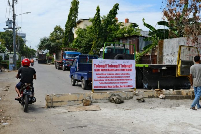 Panritanews.com | Sejumlah warga di Jalan Gatot Subroto, Kelurahan Kaluku Bodoa, Kecamatan Tallo, Makassar, melakukan aksi protes dengan memblokade jalan. Mereka mengecor badan jalan dan memasang papan berisi tuntutan, menuding Pemerintah Kota Makassar merampas tanah mereka secara ilegal, Senin (11/8/2025).